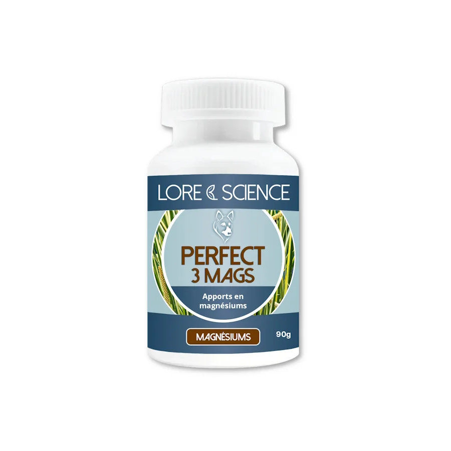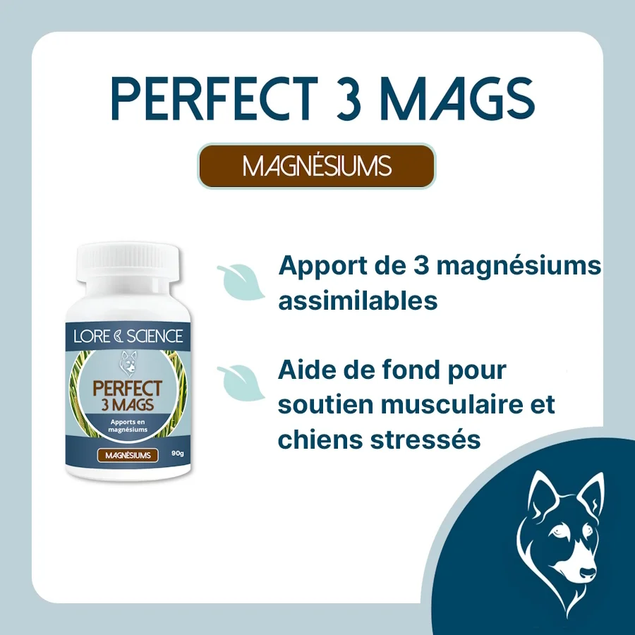 Perfect 3 Mags permet un apport régulier de magnésiums assimilables (glycérophosphate de magnésium, citrate de magnésium et magnésium marin), de L-arginine, de taurine ainsi qu’un correcteur naturel d’acidité du système digestif à l’intention du chien fournissant des efforts. Les chiens de sport et d’utilité sont souvent en déficit de magnésium, complémenter le chien en période d’effort s’avère utile pour aider à optimiser son alimentation et maintenir sa forme.